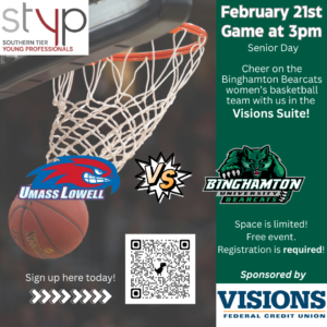 Join STYP in the Visions Suite on Saturday, February 21, 2026 at 3 PM as we watch Binghamton Bearcats women’s basketball take on the UMass Lowell River Hawks for Senior Day and the last game of the regular season! This event is sponsored by Visions Federal Credit Union!