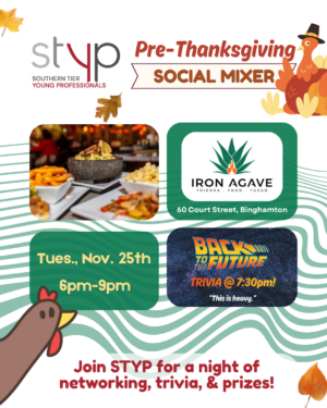 Join Southern Tier Young Professionals on Tuesday, November 25, 2025 for a Pre-Thanksgiving mixer at Iron Agave! At 7:30 PM, take part in the Back to the Future-themed trivia game! Join us for some pre-holiday fun and networking!